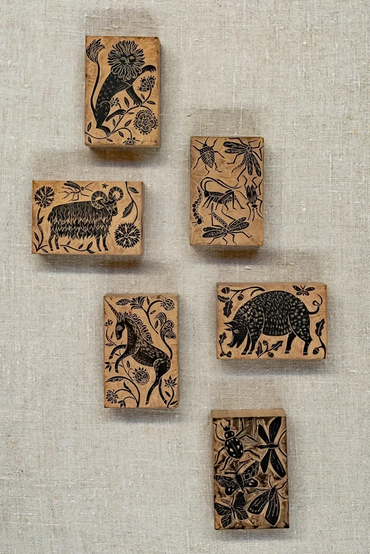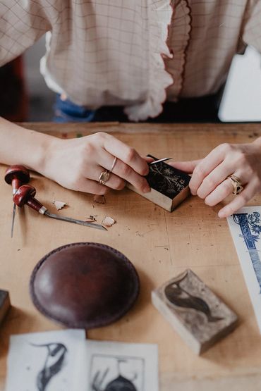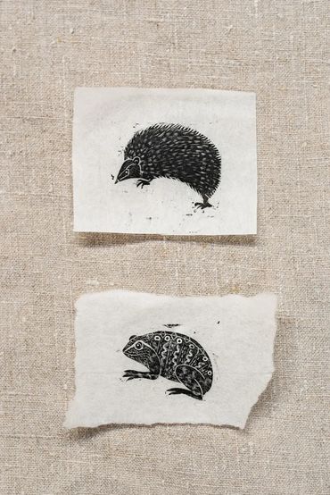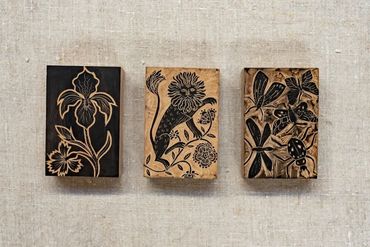Drawing inspiration from the rich heritage of craft - from Elizabethan tapestries, to the Medieval calendar and manuscripts, Naomi creates decorative designs on wood blocks. Miniature scenes are created on lemonwood blocks using fine chisels. The prints are then burnished onto fine japanese paper.